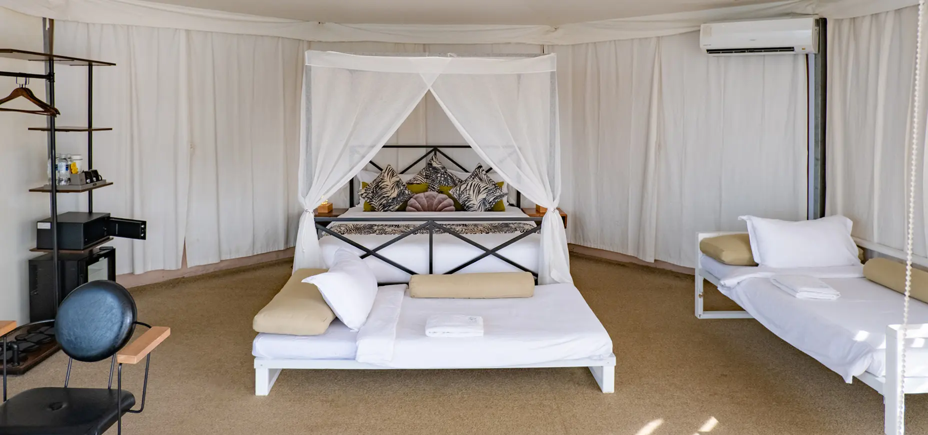 Earth tones and natural timber textures create a grounded, relaxing ambiance. A king bed, efficient workspace, and lounge chair by the window allow alternating between rest and reading. The bright, well-ventilated bathroom balances glamping charm with modern convenience. This villa epitomizes the luxurious comforts expected at a premier Batam beach resort.